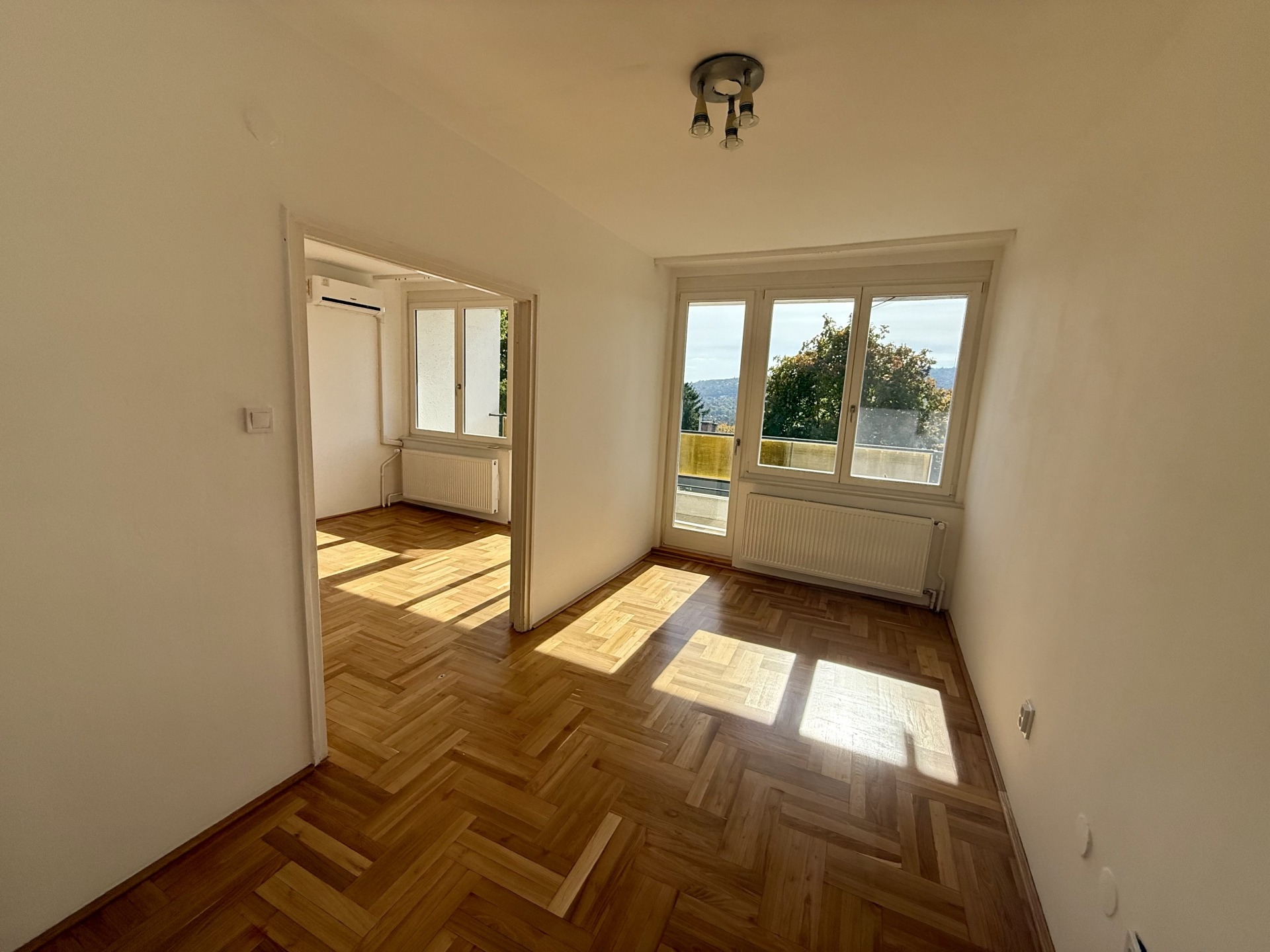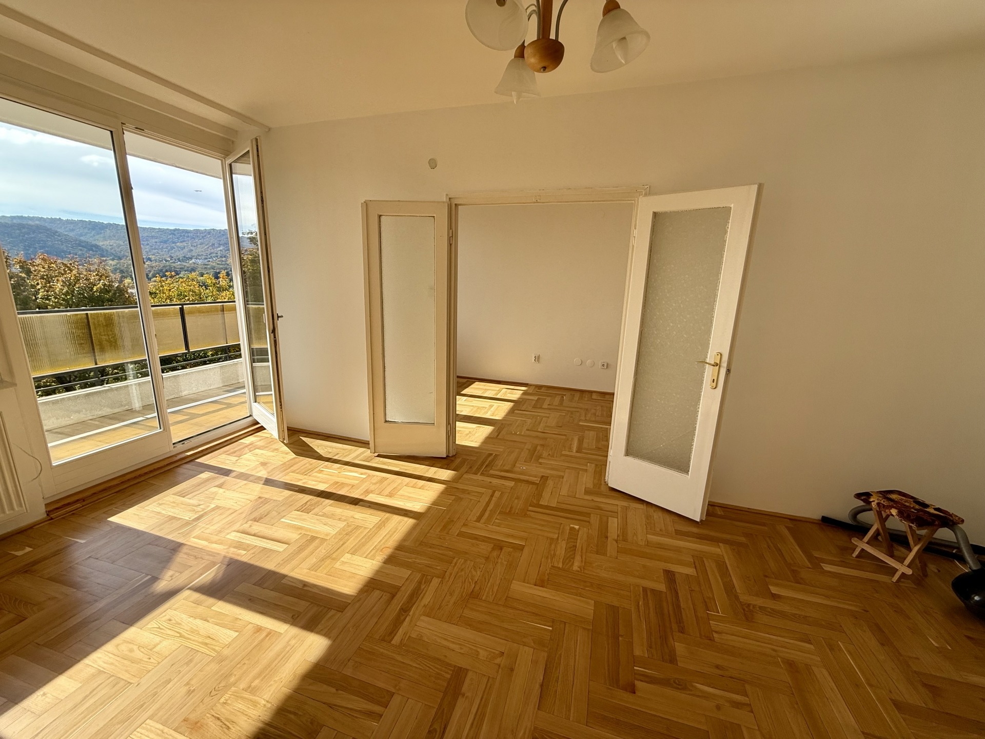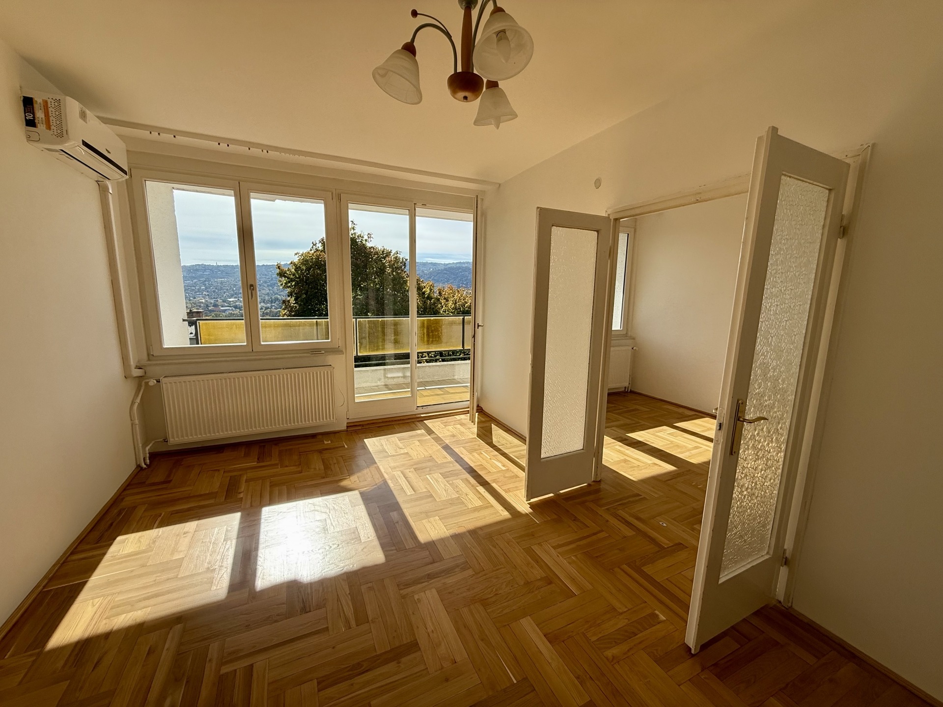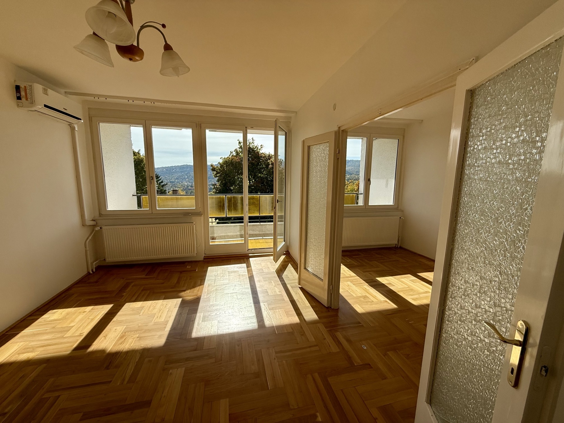 A lakás elrendezése átgondolt és élhető: két kényelmes szoba, étkező, valamint egy 8 m²-es erkély tartozik hozzá, ahonnan örök, elvehetetlen panoráma nyílik. A parketta frissen felcsiszolt és újralakkozott, a falak frissen festettek, a nyílászárók pedig 1,5 éve cserélve lettek új, minőségi fa ablakokra.